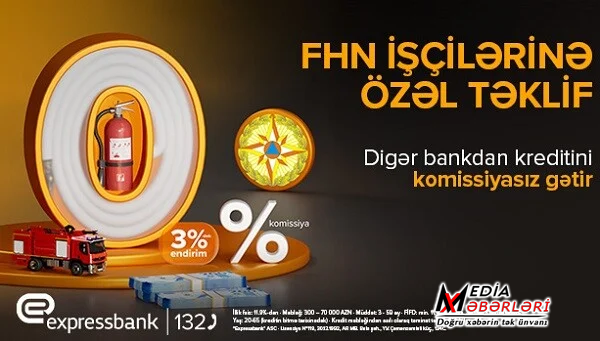 Expressbank Fövqəladə Hallar Nazirliyi işçilərinin peşə bayramının 20 illiyi münasibətilə bu sahədə çalışan şəxslərə nağd pul kreditini 0% komissiya ilə təklif edir. Kreditin müddəti 59 ayadəkdir. Üstəlik 70 000 manatadək krediti indi əldə edib əsas məbləğ üzrə ödənişə növbəti ildən – krediti aldıqdan 2 ay sonra başlamaq mümkündür. Kampaniya müddətində sözügedən sahənin əməkdaşları başqa banklardakı kredit borclarını Expressbank-a komissiyasız gətirməklə yanaşı illik faiz dərəcəsinə 3%-dək endirim əldə edəcəklər! Digər bankda olan kreditini Expressbank-a komissiyasız gətirən müştərilər illik faiz dərəcəsinə 3%-dək endirim əldə edəcəklər. · Məbləğ: 300 - 70 000 AZN · Müddət: 3-59 ay · Minimal xalis gəlir: 351 AZN · FİFD: 11.9 % - 36.6% · Ərizəçinin yaşı: 20 - 65 (kreditin bitmə tarixinədək) Təklif 21.12.2025-ci il tarixinə qədər qüvvədədir. Expressbank Bakı və regionlarda 16 filialı ilə fəaliyyət göstərir. Bankın məhsul və xidmətləri ilə www.expressbank.az saytından, 132 Məlumat Mərkəzindən və ya Bankın “İnstagram”, “Facebook”, “LinkedIN” və “Telegram” sosial platformalarındakı rəsmi hesablarından tanış ola bilərsiniz. “Expressbank” ASC ARMB tərəfindən 30 dekabr 1992-ci il tarixində verilmiş №119 lisenziya əsasında fəaliyyət göstərir. Ünvan: Bakı şəh., Y.V.Çəmənzəminli küç., 134C.