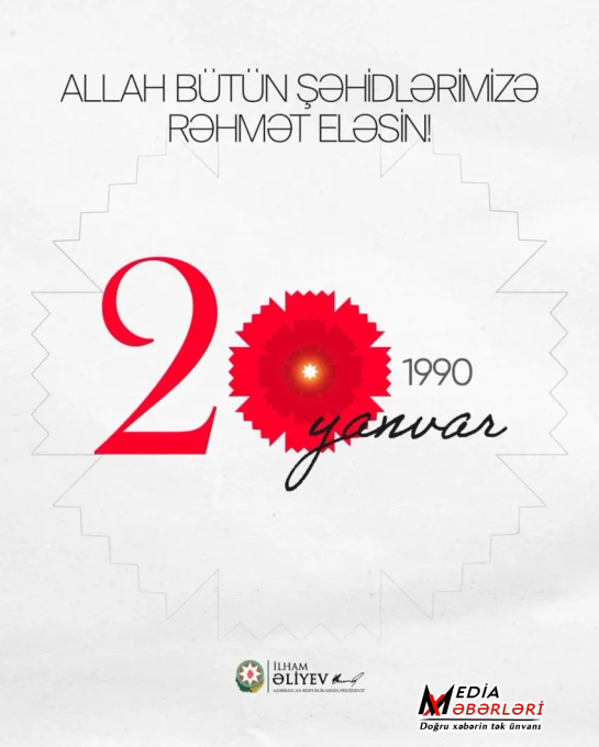 Azərbaycan Prezidenti İlham Əliyev sosial media hesablarında 20 Yanvar faciəsinin 36-cı ildönümü ilə bağlı paylaşım edib. Paylaşımda yazılıb: "Allah bütün şəhidlərimizə rəhmət eləsin!"