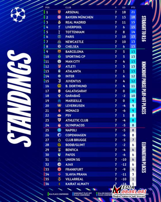 “Qarabağ” Çempionlar Liqasının əsas mərhələsində “Ayntraxt”ı 3-2 məğlub etməklə turnir cədvəlində irəlilədi. Mediaxeberleri.Azxəbər verir ki, xallarının sayını 10-a çatdıran təmsilçimiz hazırda 18-ci pillədə qərarlaşıb. Cədvəldə 17-ci pillədə isə Türkiyə təmsilçisi "Qalatasaray" yer alır. "Qarabağ" Liqa mərhələsinin son görüşündə "Liverpul"la (İngiltərə) qarşılaşacaq. Ağdam təmsilçisi son oyundan əvvəl pley-offa yüksəlmək üçün yaxşı şans qazanıb. Xatırladaq ki, ÇL-in Liqa mərhələsində ilk 8 yeri tutan komanda birbaşa 1/8 finala, 9-24-cü yeri tutanlar isə pley-off mərhələsinə vəsiqə qazanır. 25-36-cı yeri tutanlar avrokuboklarda çıxışlarını başa vururlar.