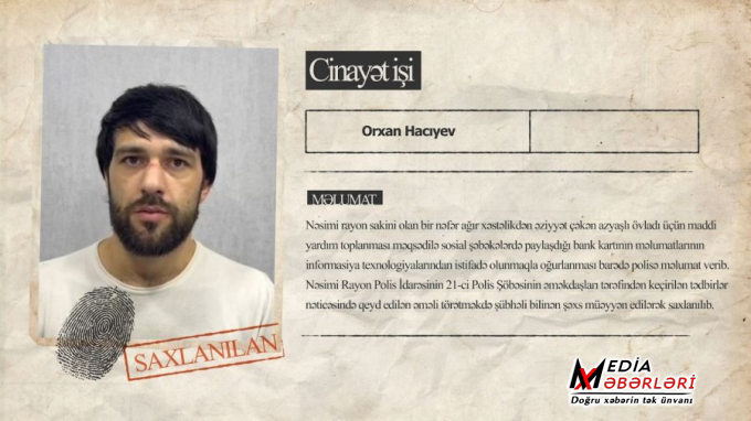 Ağır xəstəlikdən əziyyət çəkən azyaşlıya yardım məqsədilə toplanan pulu talayan şəxs saxlanılıb. Daxili İşlər Nazirliyindən verilən məlumata görə, Nəsimi rayon sakini olan bir nəfər ağır xəstəlikdən əziyyət çəkən azyaşlı övladı üçün maddi yardım toplanması məqsədilə sosial şəbəkələrdə paylaşdığı bank kartının məlumatlarının informasiya texnologiyalarından istifadə olunmaqla oğurlanması barədə polisə məlumat verib. Nəsimi Rayon Polis İdarəsinin 21-ci Polis Şöbəsinin əməkdaşları tərəfindən keçirilən tədbirlər nəticəsində qeyd edilən əməli törətməkdə şübhəli bilinən Orxan Hacıyev müəyyən edilərək saxlanılıb. O.Hacıyev ifadəsində həmin bank kartının konfidensial məlumatlarını əldə edərək hesabda olan pul vəsaitini müxtəlif kartlara köçürdüyünü və sonradan nağdlaşdırdığını bildirib. Faktla bağlı araşdırma davam etdirilir.